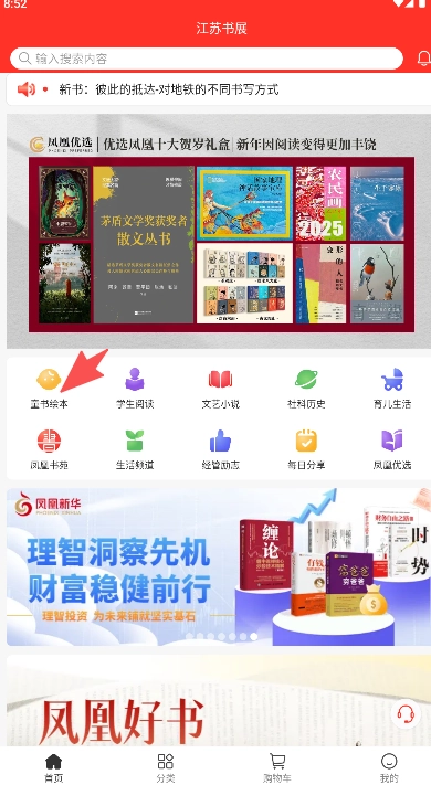 1、在首页的江苏书展页面中,点击“童书绘本”选项即可进入。