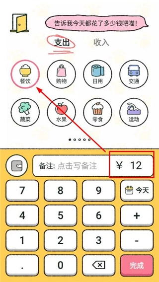 1、打开软件首页后,点击“记账”选项,页面会显示“支出”和“收入”两个分类;接着填写具体金额,根据消费或收入类型选择对应的标签,最后点击“完成”按钮,即可完成本次记账操作。