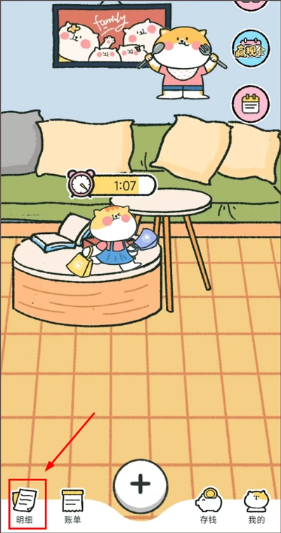 1、打开喵喵记账应用,进入首页后点击页面下方的【明细】选项