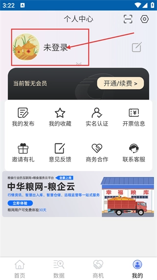 1、在中华粮网首页点击底部的【我的】按钮,就能进入个人中心页面。
