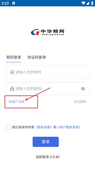 3、进入登录页面后,选择【新用户注册】选项,该页面支持密码登录、验证码登录两种账号登录方式。