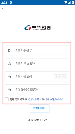 4、进入新用户注册页面,依次填写【手机号】【单位名称】,获取并填写【验证码】,设置6-20位密码。