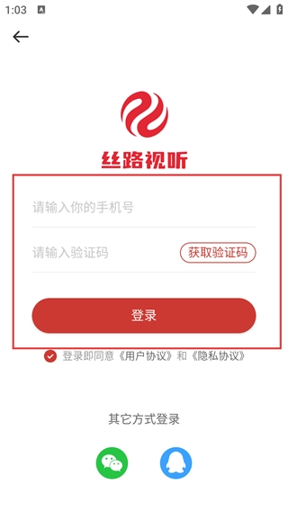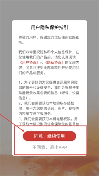 在仔细阅读《用户协议》和《隐私协议》的所有条款后,点击【同意,继续使用】按钮,就能进入丝路视听应用。