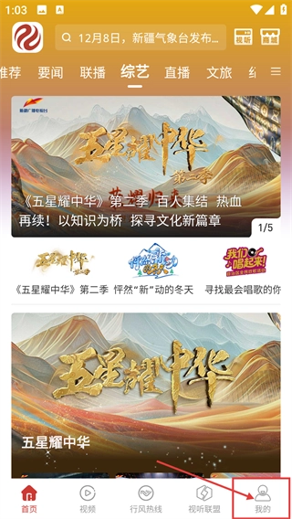 2、在应用首页点击底部【我的】按钮,首页涵盖综艺-直播等内容板块,可进入个人中心页面。