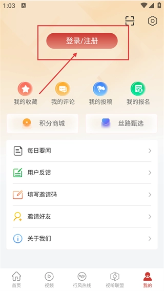 3、进入我的页面后,点击【登录/注册】按钮,该页面包含我的收藏-我的评论等功能选项。