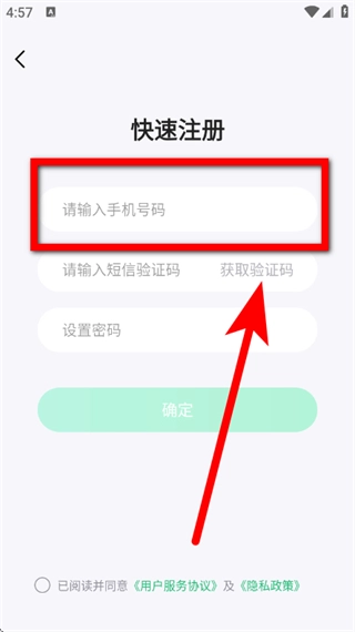 4、在快速注册页面,输入手机号码,点击获取验证码。