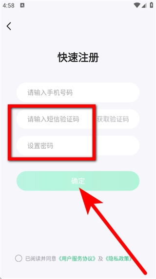 5、输入短信验证码,设置密码,勾选协议后,点击确定,完成注册。