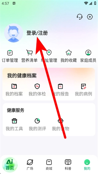 2、在个人页面,点击登录注册,进入登录界面。