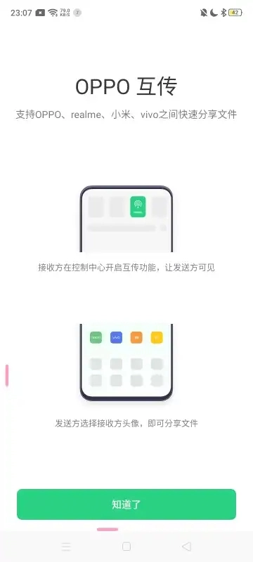 OPPO互传是OPPO手机系统的传输工具,现在只要设备安装了OPPO互传,就能在OPPO、realme、小米、vivo之间快速分享文件,操作步骤很简单:接收方先在控制中心打开互传功能,让发送方能够搜索到;发送方找到接收方的头像并选中,就能完成文件分享了。大家快试试吧!