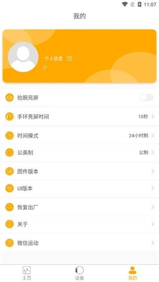 5. 在我的页面中,可设置手环亮屏时间、时间模式等。