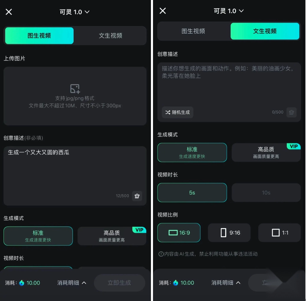 4、“可灵AI”内生成的视频时长有5秒和10秒两个方案,最长可达10秒,与主流的同类型产品差不多。