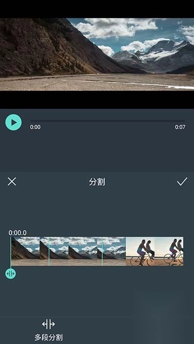 分割:点击“分割”进入分割界面,将分割游标放在你想要分开的位置,点击“多段分割”后保存,便可将视频分割成多个片段。另外,如果想要修改,请在保存之前点击“重置”便可恢复原来的视频片段。