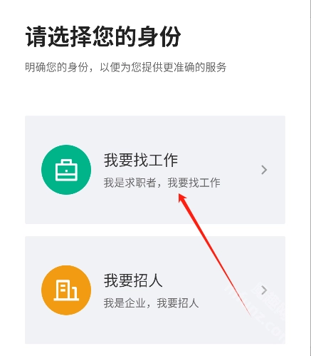 5、如果你是个人请选择“我要找工作”,如果你是企业管理者请选择“我要招人”。这里以个人为例