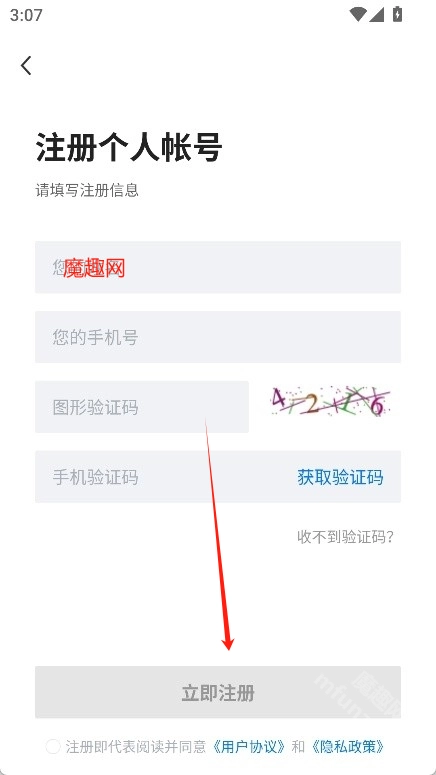6、填写你的姓名、手机号码以及手机验证码,还有图形码。然后点击“立即注册”就算注册成功