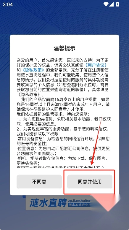 1、首先在魔趣网下载并安装涟水直聘应用。进入软件时点击“同意并使用”按钮即可进入。
