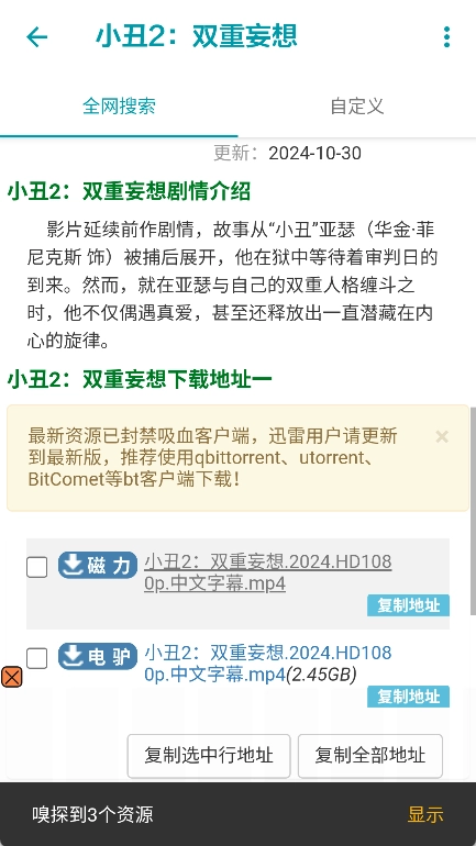 2、找到想要的视频资源后,点击进入资源详情页面中,软件会自动探嗅到磁力链接。