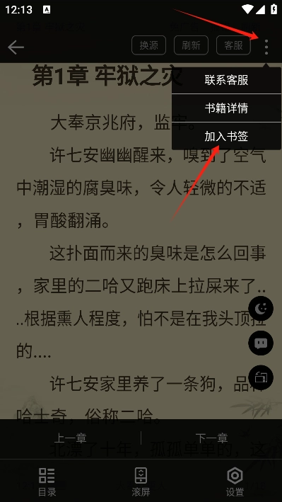 4、在菜单的右上方找到并点击更多设置按钮,在弹窗中选择“加入书签”。