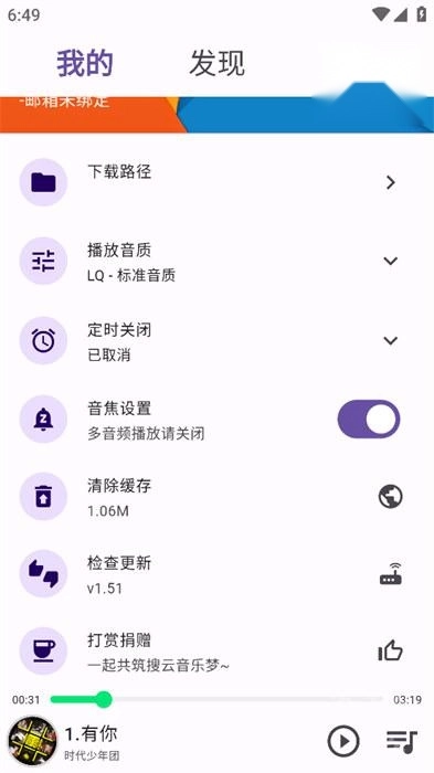 5、在我的里面可以选择音乐资源播放的音质和定时关闭;