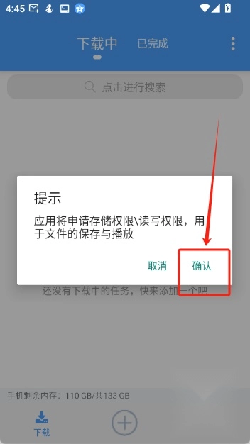 2、进入首页点击中间的“+”号,这里需要用户点击“确认”来开启手机存储权限