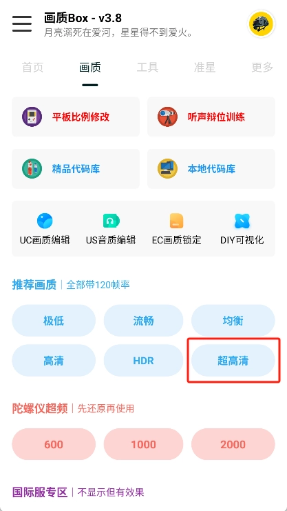 3、画质设置:在主界面可以根据自己的需求选择画质方案,如“超高清+120帧率”。