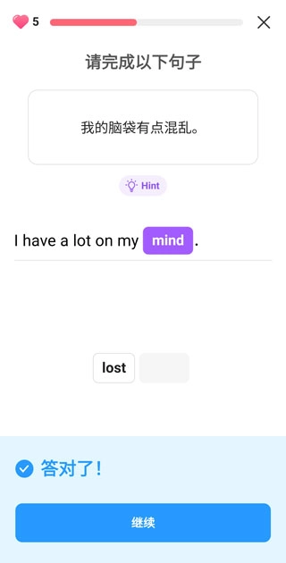 3、听力练习:系统会提供5个句子并通过语音播放,用户需记住这些句子然后点击“继续”。