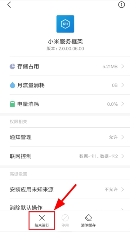 5、在小米服务框架页面,最下方点击【结束运行】。