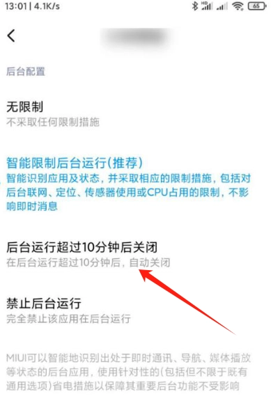 6)选择后台运行超过十分钟或是禁止后台运行就可以很好的阻止后台运行了。