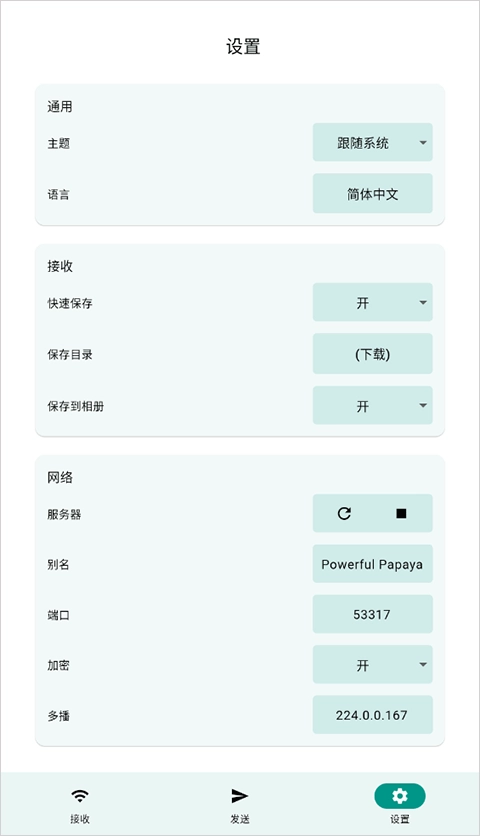 1、操作十分简便,整体功能界面也基本一目了然,大致可划分为「接收」「发送」「设置」三个主要部分。