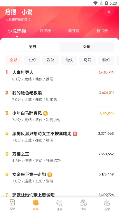 多维度分类系统,按题材、热度、字数等条件筛选作品。