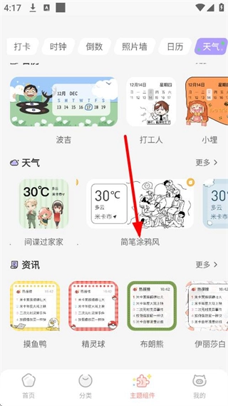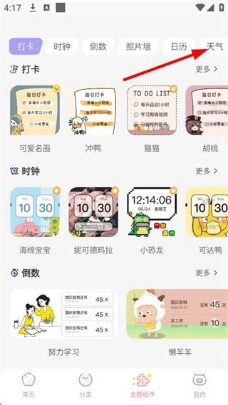 2、在主题组件页面,点击天气,进入天气组件分类页面。