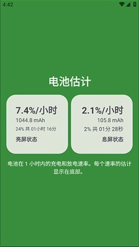 1、专门用于电池电量统计的部分,包括充放电百分比和估计的完全充放电时间。