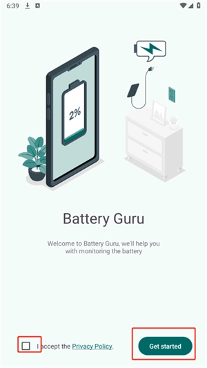如何用Batteryguru查看电池健康度 1、打开软件后,用户需点击屏幕左下方的小方框,完成点击后,再点击屏幕右下方的【get started】按钮;