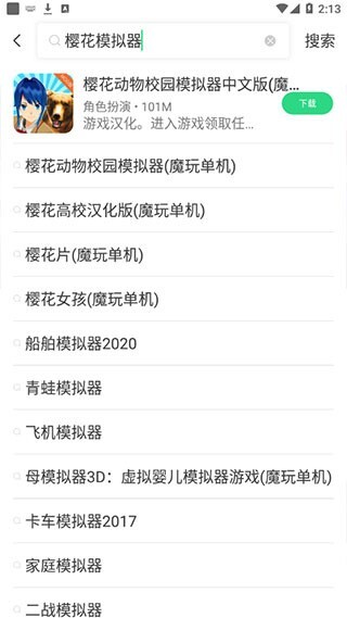 3、接着点击首页右上方的搜索图标,输入想要查找的名称(比如樱花模拟器),下方就会显示出该名称对应的内容或相关类型的结果。