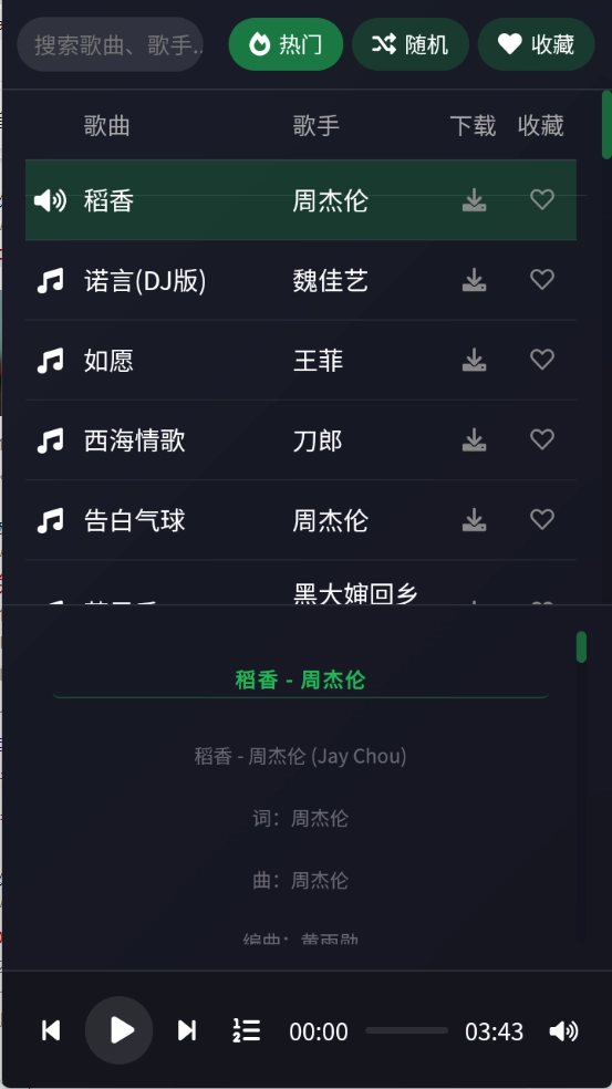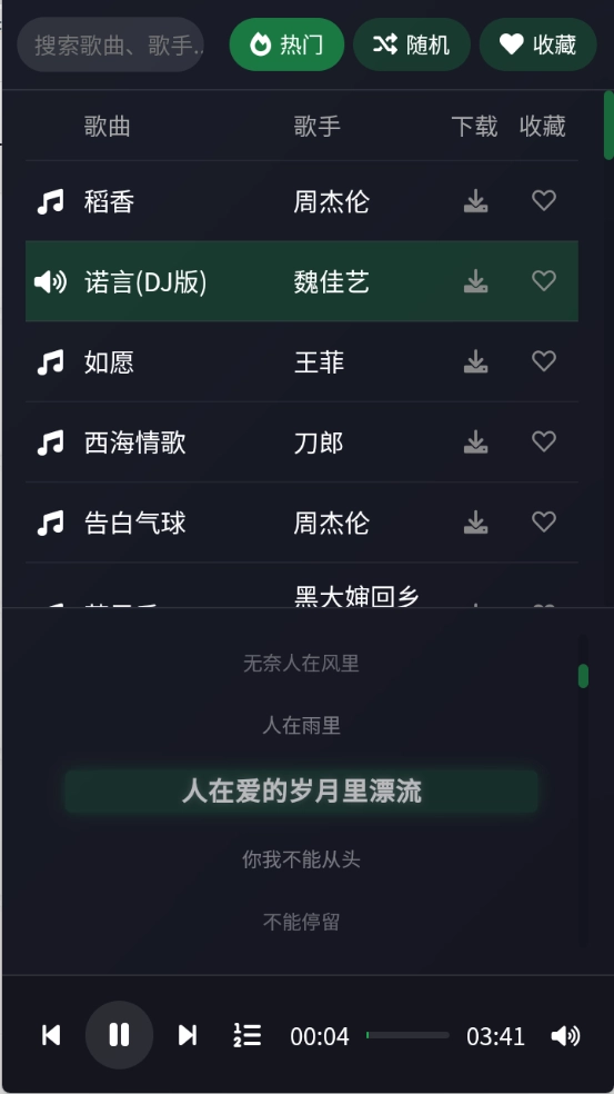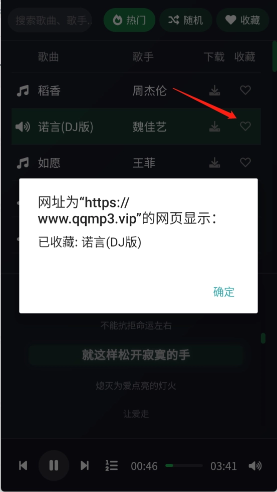 4、点击歌曲后面的收藏按钮可以收藏音乐。