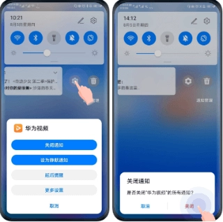 方法二:消息出现时左滑消息,点击设置图标,再点击关闭通知按钮,弹窗中选择关闭即可关闭华为视频通知消息。