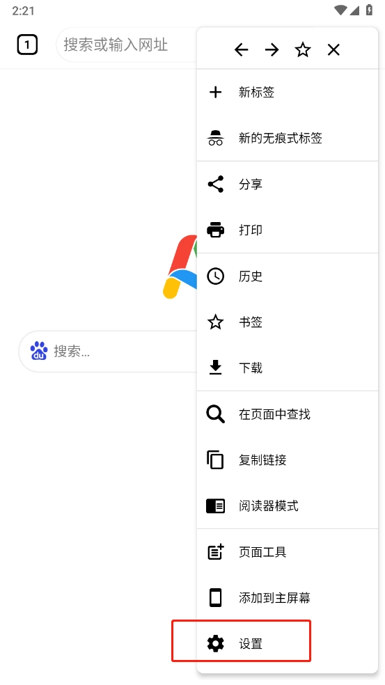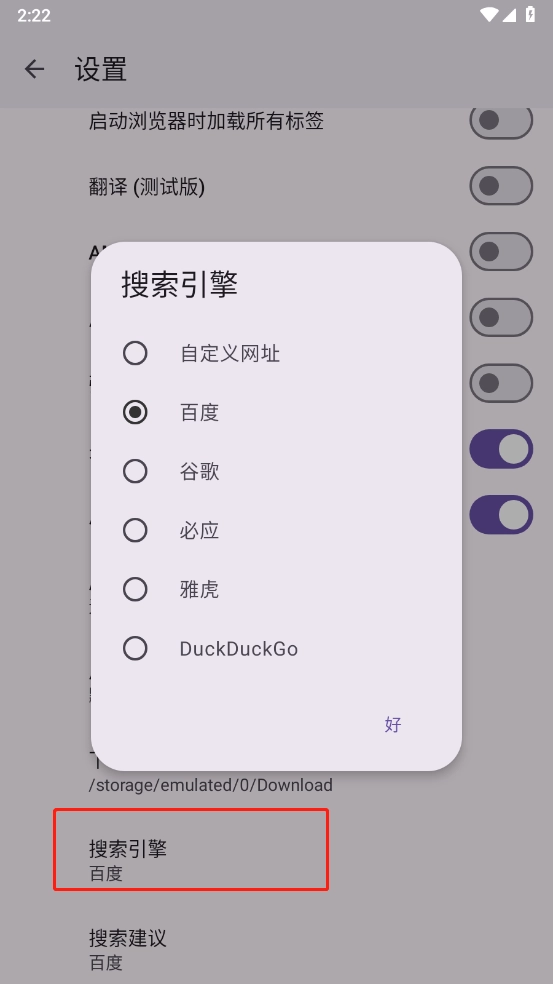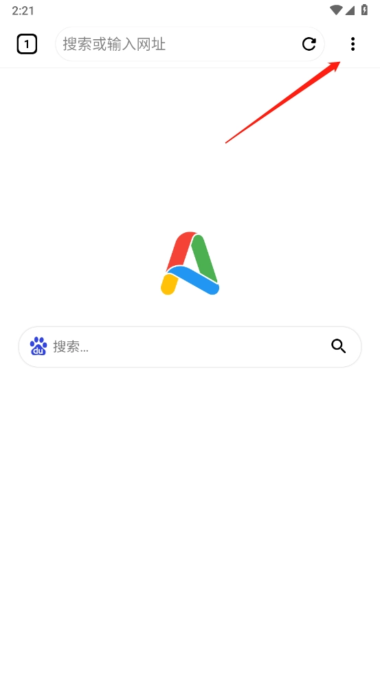进入后能看到默认搜索引擎为百度,若需更换其他搜索引擎,可点击右上角的三个点。