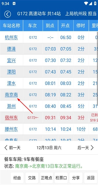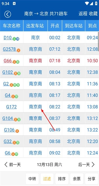 2、进入车次列表页面,查看南京到北京的车次信息,选择G172车次进入其详情页面。