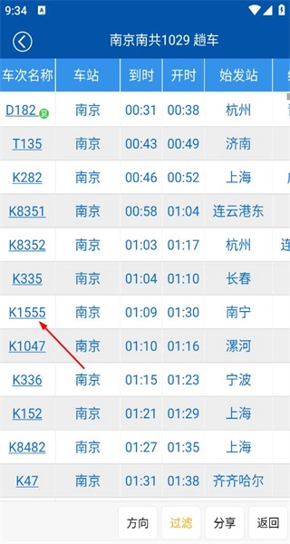 4、进入南京南车次列表页,查看经停南京南的车次信息,浏览各车次的到时开时等内容。