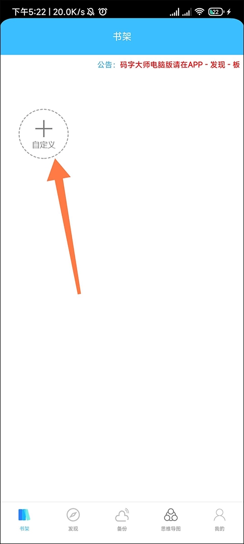 1、启动码字大师应用,进入书架页面后,点击界面上箭头指示的自定义加号图标。