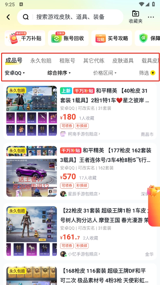3、找到想要交易的游戏之后点开,有很多的账号类型,无论是成品号、永久包赔还是租账号都有。