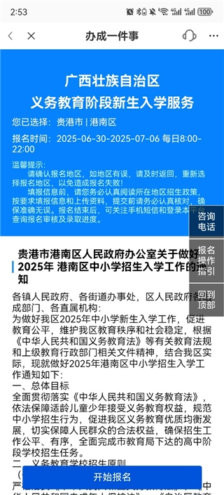 在首页"办成一件事"服务中找到小学/初中报名入口