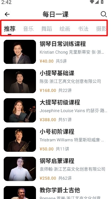 2、在课程推荐区域可看到音乐、舞蹈、绘画、书法等不同类型的学习内容。