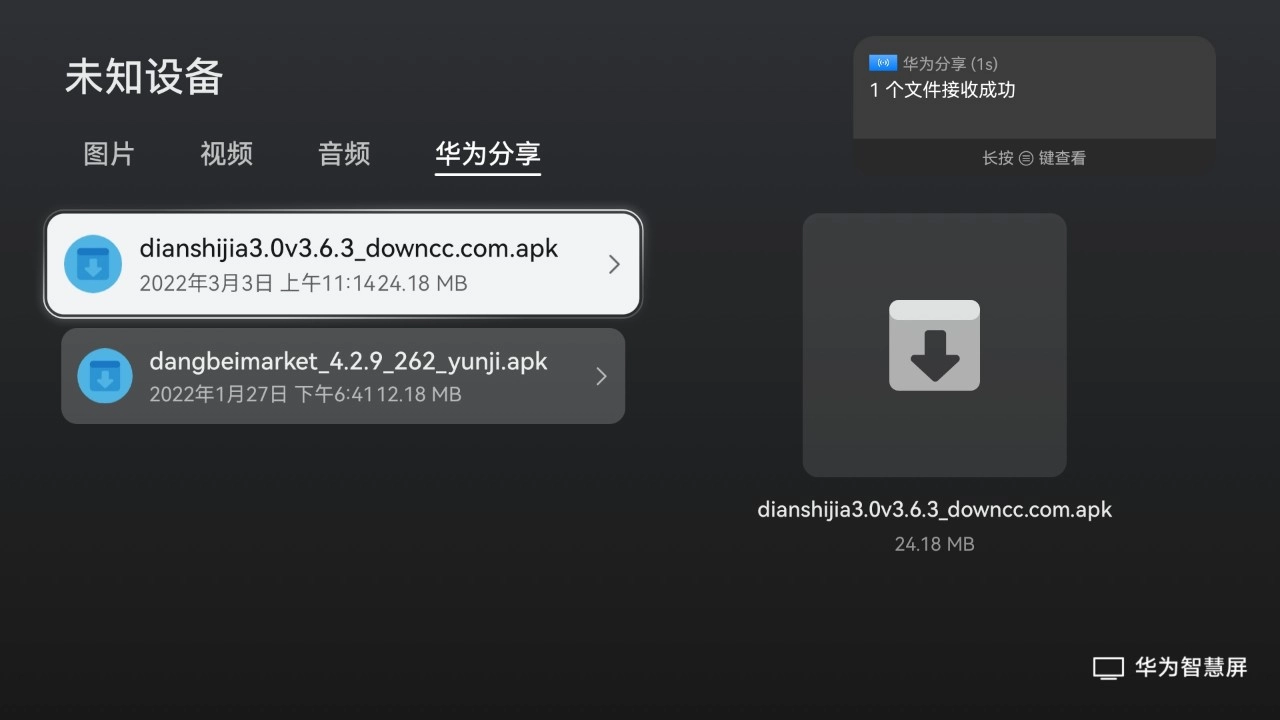 3、Huawei Share分享安装:华为手机APK应用,Huawei Share分享到智慧屏上安装。