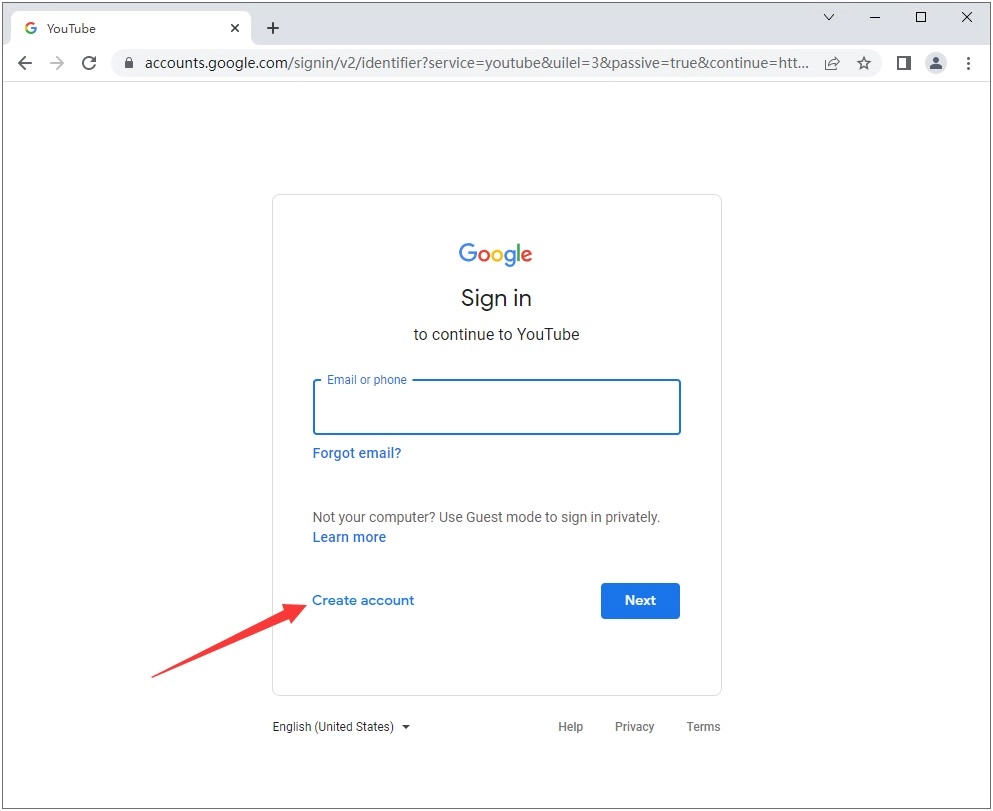 2、然后会跳转到谷歌的注册界面(因为谷歌和YouTube是一家公司的产品),我们点击底部“Create account”按钮。