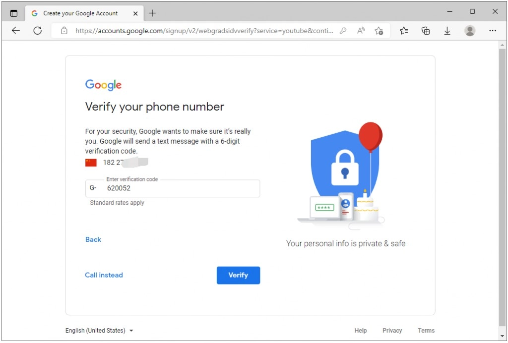 8、输入您收到的手机验证码,很多人在这一步就无法进行下去,主要是浏览器没有使用英文,而导致接受不到验证码,被谷歌提示“此电话号码不能用于验证。”。