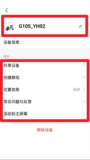 1、进入设备设置页面后,能够查看车辆编号,同时支持对车辆名称进行修改、共享该设备、设置位置权限以及移除当前车辆。