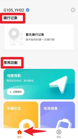2、进入首页后可查看骑行记录、进行地图导航,还有常用功能,可以实时查看车辆定位及电池电量等信息。