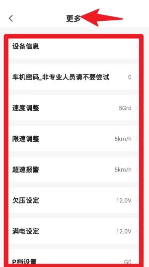 3、在更多菜单中可对速度、限速、电压报警等进行精细设置,保障行驶过程更加安全稳定。