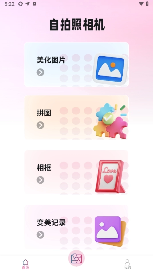 1、首先打开软件主界面,就能看到4种功能,包括美化图片、创意拼接拼图、为图片添加漂亮相框,以及查看自己的编辑记录,功能相当强大;