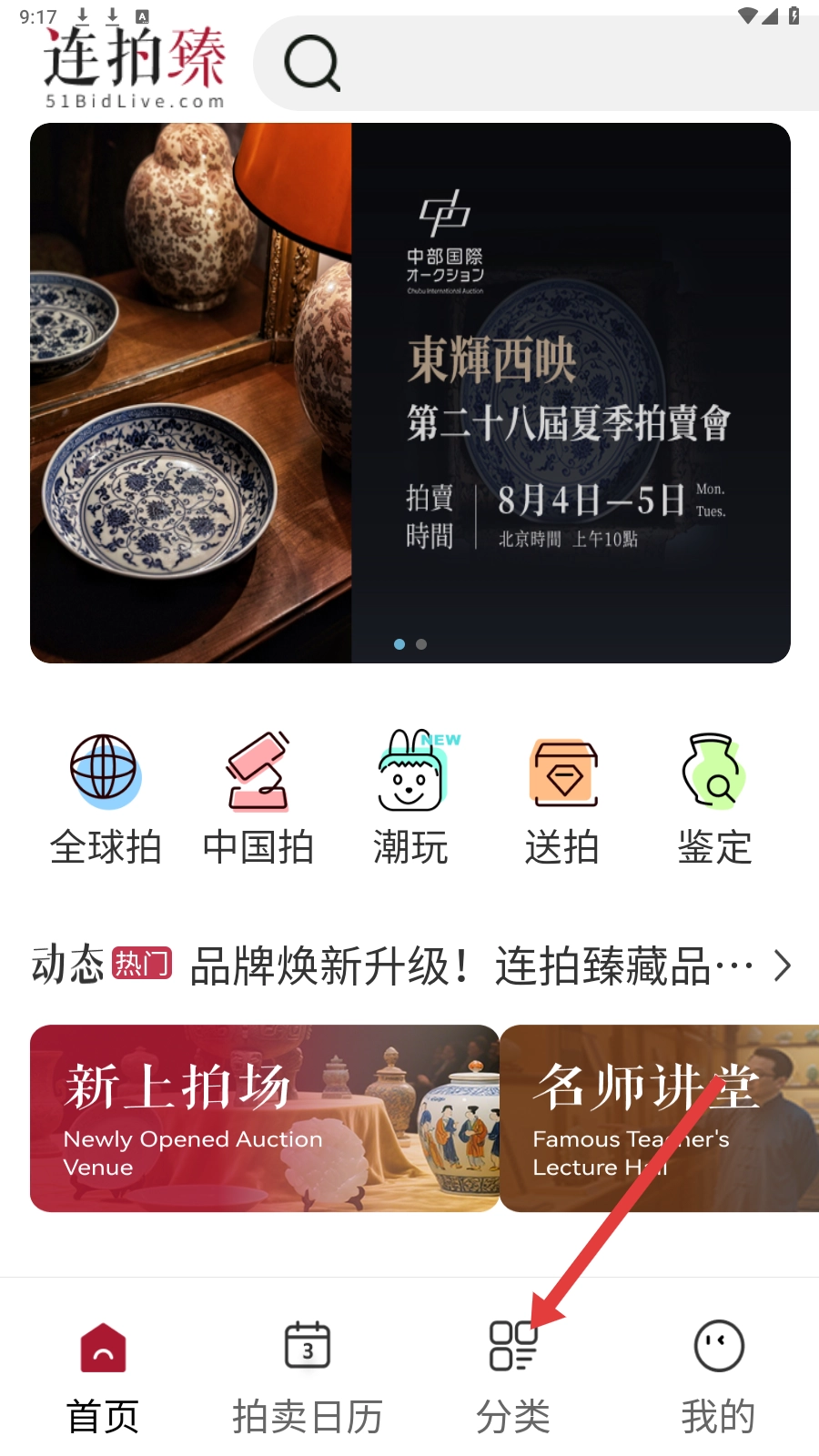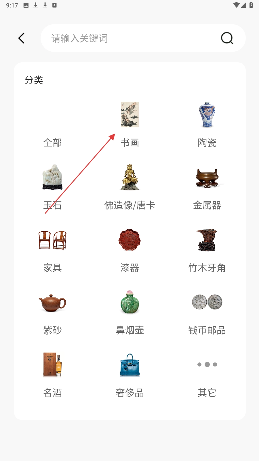 2、在分类页面中,点击【书画】分类图标,查看书画类拍卖品。